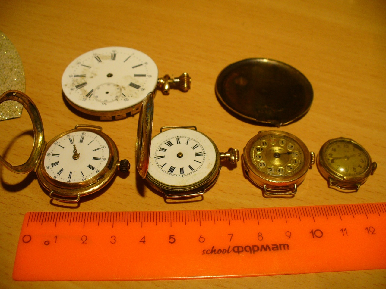 Здравствуйте.Вспомнилось как в детстве увлекался часами(копался,когда ломал,когда делал) и ностальгия одолела.Вот кое что,что осталось.Были ещё двое трёхкрышечные золотые с одинаковыми механизмами,из двух собрал одни(они из них были и с золотой крышкой и механизма),но по глупости продал за 500баксов в девяностые,состояние корпуса было идеальное.От вторых с мет.крышкой продал в лом,остался механизм 42мм и цифры(испачканы на фото,легко ототрутся),все часы не на ходу.Вал маятника сломан только у средних,на первой фото,которые слева в низу,да и у вторых,что снизу,из золота только боковые крышки.