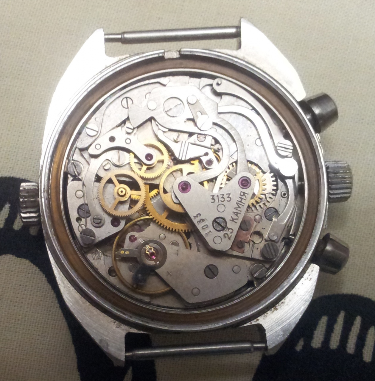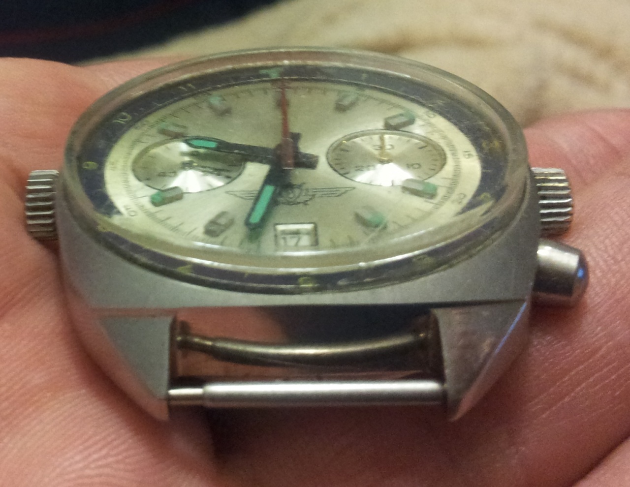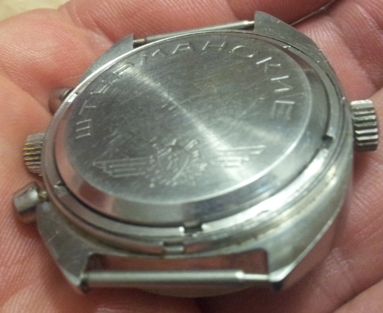 Полет штурманские, калибр 3313, мех. №1033, после ремонта и обслуживания, работает все. При ремонте не нашлось родных стрелок хронографа, поставлены: секундная от других штурманских (более поздней модели), счетчика минут просто желтая. Особенности хронограф запускается верней кнопкой, остановка и сброс на "0", нижней ? Стрелки родные ищутся, при замене цена возрастет. Фото по запросу.
