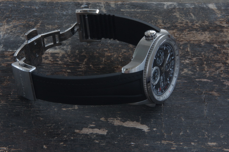 Застежка “бабочка” так же сатинированная с полированными гранями, и имеет гравировку “HAMILTON”. Склонности к случайному расстегиванию не имеет, фиксируется крепко.