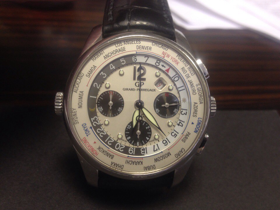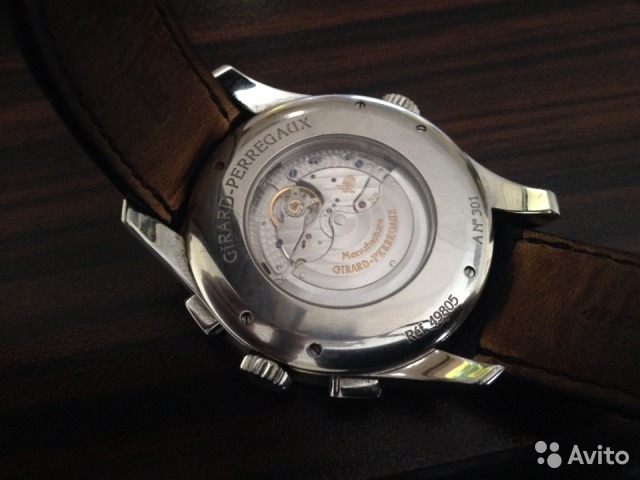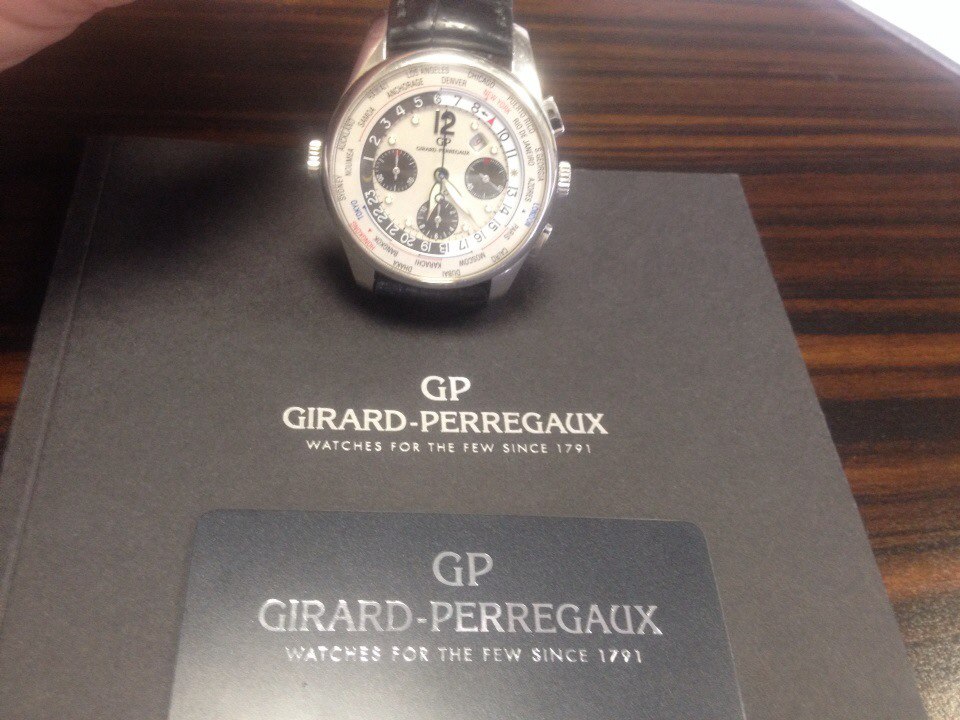 Часы GIRARD-PERREGAUX 49805 механические, оригинал. Состояние отличное! Куплены в 2010г. в Арабских Эмиратах почти за 20 000$. Были в эксплуатации около года до покупки других часов. На ремешке есть следы от носки. Коробка отсутствует. Есть гарантийная карточки и руководство пользователя. Размер корпуса 43 мм, толщина- 13,45 мм, стекло- сапфир, материал корпуса - сталь, ремешок- кожа аллигатора, функции: часы, минуты, секунды, хронограф, дата, мировое время, запас хода 46 часов, задняя крышка прозрачная. Возможен небольшой торг.