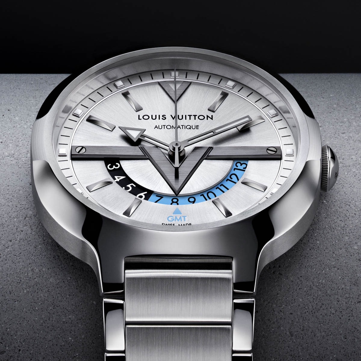 Оформление циферблата выстроено вокруг буквы V, гением Гастона-Луи Витттона превращенной некогда в один из фирменных знаков дома Louis Vuitton. К слову, здесь использовано сразу две буквы V: одна заменяет собой индекс на 12-часовой отметке, вторая – является продолжением стального моста, который делит пространство циферблата на 2 части. Матовая текстура букв и их полированные края образуют интересный визуальный контраст с общим фоном циферблата, декорированного мотивом «солнечные лучи», и идеальной полировкой корпуса. Острие большой буквы V служит указателем для дугообразной GMT-шкалы в нижней части циферблата. Шкала представляет собой диск с 24-часовой разметкой, который одновременно служит указателем день/ночь.