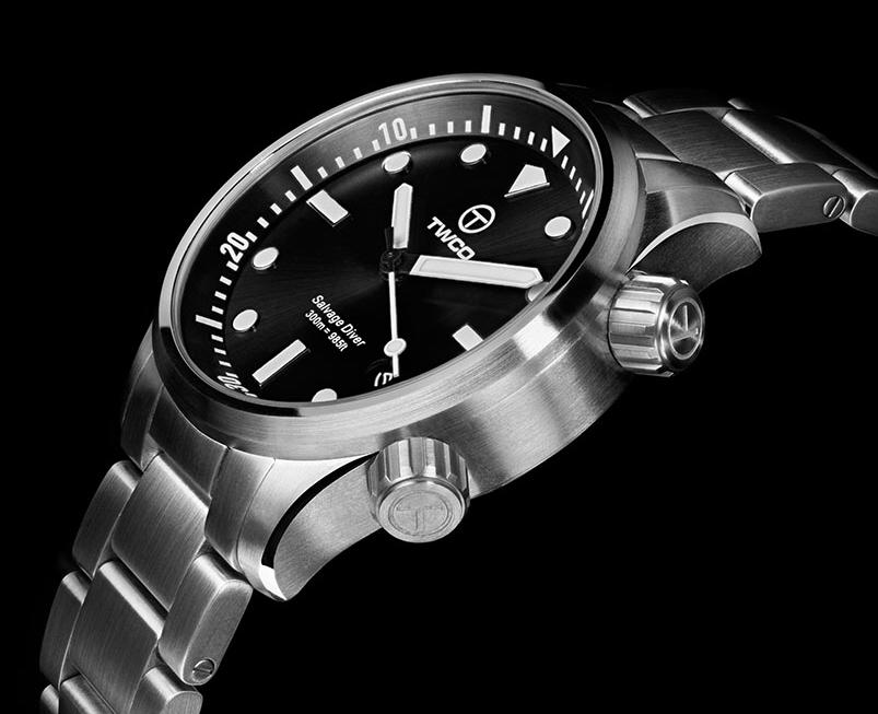 Новая дайверская модель Salvage Diver от голландской часовой компании TWCO имеет круглый сатинированный корпус, изготовленный из нержавеющей стали, диаметром 43,0 мм, толщиной 14,0 мм, с 22-миллиметровым расстоянием между ушками, водонепроницаемый до 300 метров. На торцах завинчивающихся рифленых заводной головки (расположенной на 4 часах), и головки (расположенной на 2 часах), посредством которой вращается внутреннее кольцо с дайверской разметкой, выгравированы логотипы бренда TWCO. Сапфировое стекло установлено на передней стороне часового корпуса (с антибликовым покрытием) и на его завинчивающейся задней крышке. Матово-черный циферблат с накладными часовыми индексами, покрытыми, как и стрелки, белым люминесцентным составом Superluminova, светящимся во тьме голубым цветом. Модель оснащена японским автоматическим механизмом Miyota 9015, на 24 камнях, с балансовой частотой 28800 полуколебаний в час (4 гц), 42-часовым запасом хода, функциями индикации часов, минут, секунд (посредством соответствующих центральных стрелок) и даты (посредством соответствующего цифрового указателя в апертуре, расположенной между 4 и 5 часами).