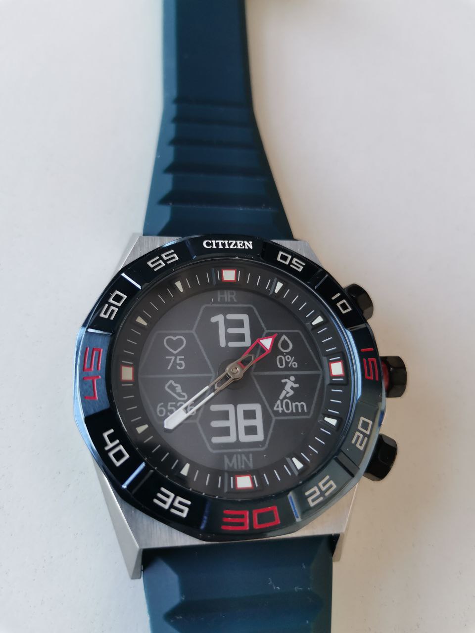 Захотелось попробовать, но, желательно, чтобы был не просто экранчик, а и настоящие стрелки и заряжать все же не каждый день. У Citizen пару лет назад вышло второе (Gen2) поколение смарт-часов, как раз гибриды + распродажа, как не воспользоваться? Насколько я понял, технологию гибридов и программное обеспечение Citizen использовала от Fossil, которые ранее выпускали подобные часы.