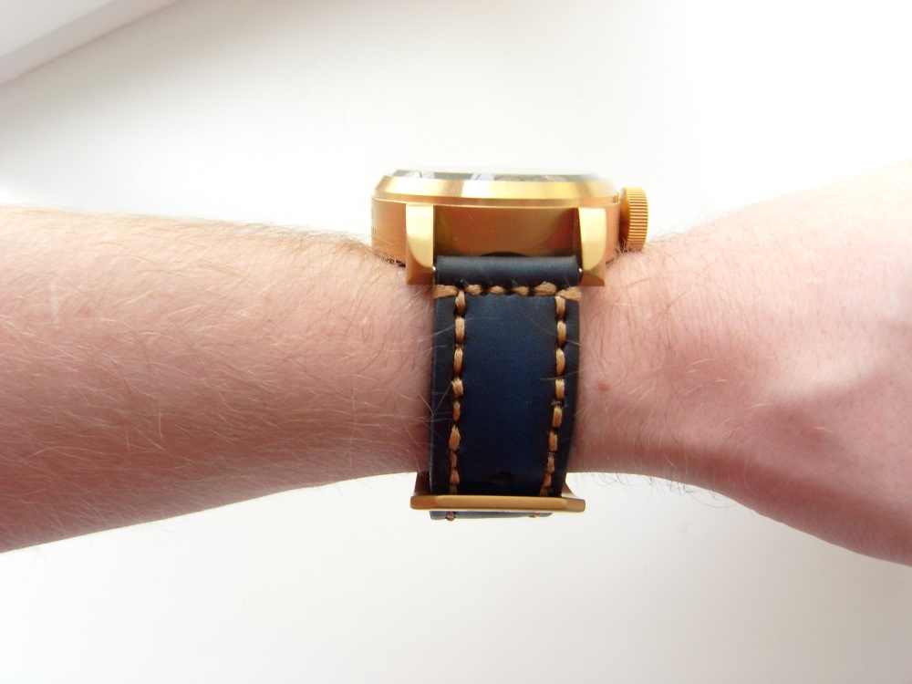 Ну и пара слов о ремешке. Стандартный — длинный кожаный НАТО, очень тонкий для часов не очень подходит на мой взгляд. Плюс ко всему ещё и добавляем им толщины. Поэтому я сразу же заказал обычный синего цвета с оранжевой строчкой, там же на ebay у продавца StrapsCo. Ремешок, не сказать, что совсем плохой, но и хорошим назвать его не могу. Он очень топорный и неаккуратный. Классический китайский ремешок за $10-12 долларов. Но не за $25 как за него просят. Стандартную баклю я поменял на ту, что шла с часами для полной аутеинтичности) В общем ремешок крайне не рекомендую. В планах купить что-то более подходящее и рыжую баклю с подлодкой)) Конечно, подлодка к авиаторам как-то не очень подходит по смыслу, но хочется так) Будем считать это дружбой родов войск)