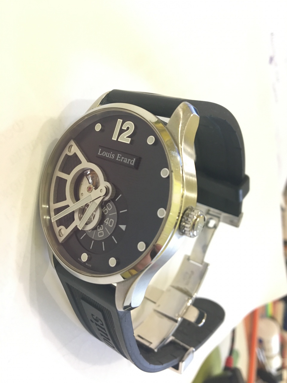 Описание Секундная стрелка вынесена на отдельный циферблат. Сквозь прозрачное окошко на циферблате можно наблюдать работу механизма часов.