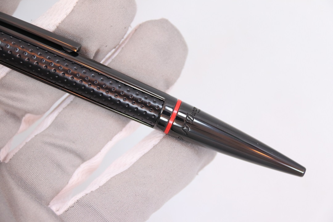 Шариковая ручка S.T. Dupont McLaren Limited Edition представляет собой пишущий инструмент обтекаемой формы, которым исключительно легко писать благодаря идеальной текучести гелевых чернил. Ее конический корпус сочетает в себе металлический каркас, изготовленный высокоточным инжекционным способом, и оболочку из перфорированной с помощью алмазной матрицы кожи с блестящей черной отделкой поверхности.