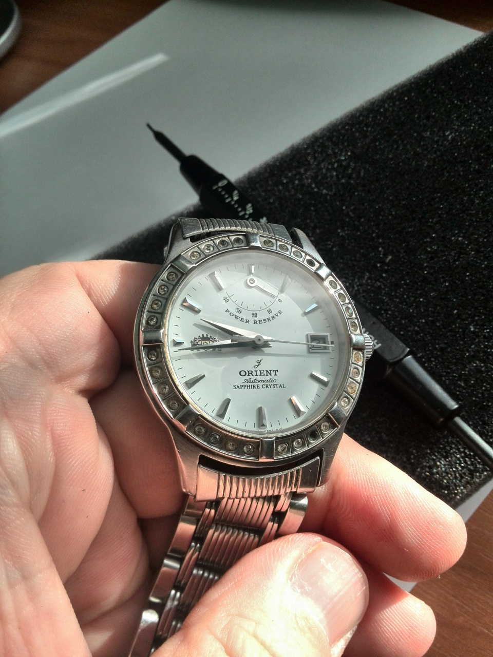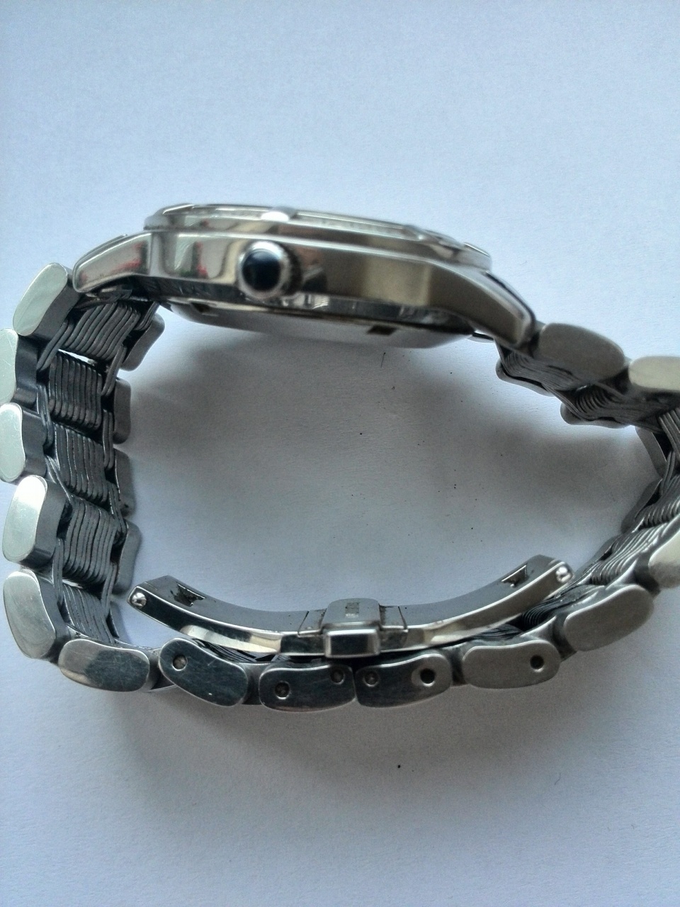 Коллекция пополнилась такой вот необычной моделькой: сапфир, резерв хода, какая-то буква "F"(?), золотистое лого, камешки на безеле, механизм 46N40, бакля бабочка, браслет тоже не простенький, но розшатанный; кабошон на ЗГ.