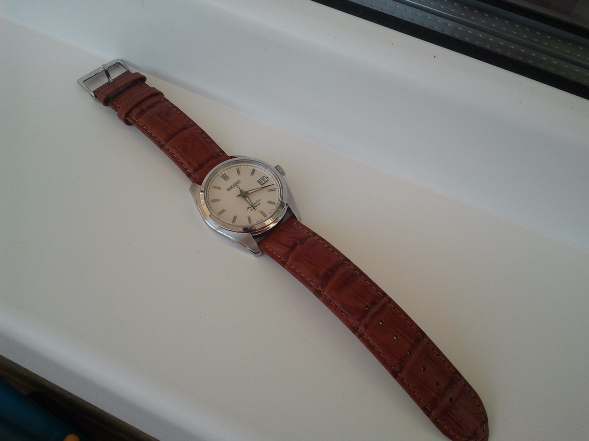 http://forum.watch.ru/showthread.php...hlight=sarb035 . Сначала не поверил своим глазам, всего 5000 ! Сразу задал вопрос продавцу, не опечатка ли, ответ : нет. Мгновенно резервирую и на следующий день произвожу оплату (как оказалось вовремя успел, так как продавца засыпали более привлекательными предложениями, но он оказался очень порядочным (за что огромная благодарность!) человеком, который сохранил резерв за первым откликнувшимся). Через 5 дней часы оказались у меня. На первый взгляд показались мелковатыми и легковатыми. Но на руку сели идеально (где-то 17.5см запястье). А вчера был прикуплен кожаный ремешок (см.фото) - результат, на мой взгляд, выше ожидай. Даже чем-то стали похожу на мой идеал: