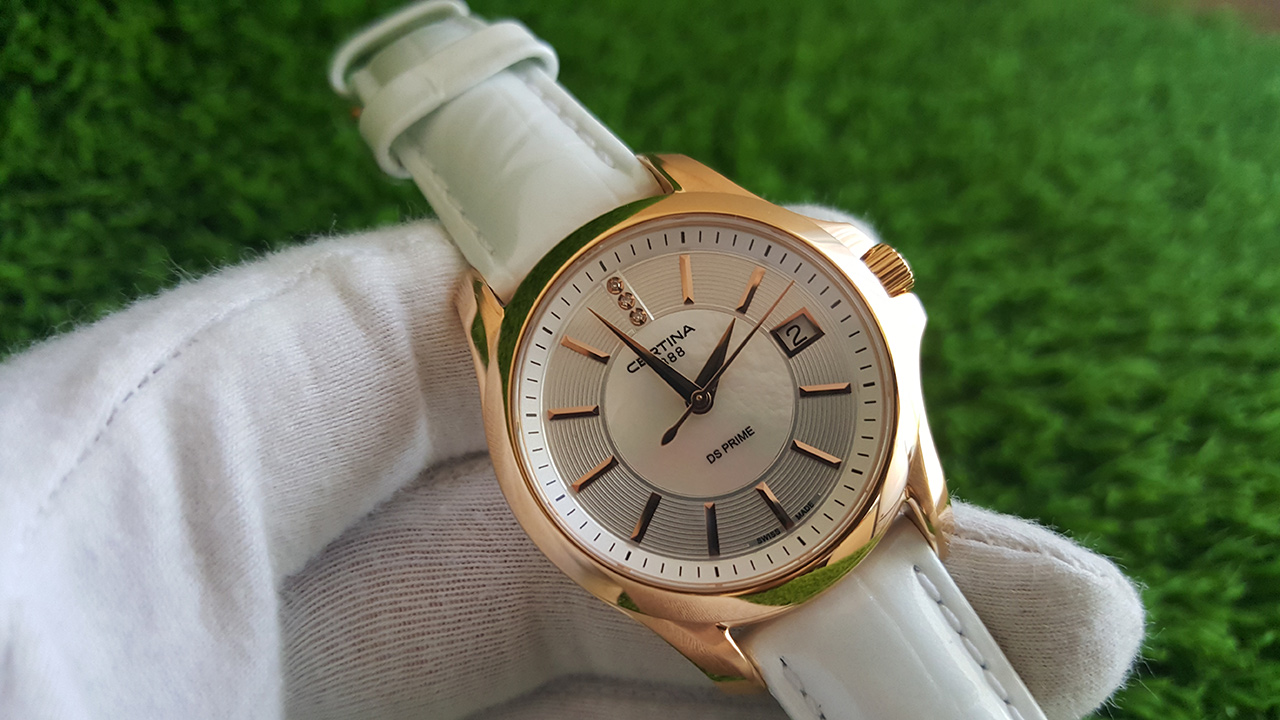 DS Prime Round. Циферблат перламутровый с гильошированием, аппликация часовых индексов инкрустация 3 бриллиантов в качестве часовой метки на 12 часах. Задняя крышка с гравированным логотипом. Кожаный ремешок с тиснением под аллигатора, браслетная застежка тройного сложения типа бабочка. Функция индикации заряда (EOL).