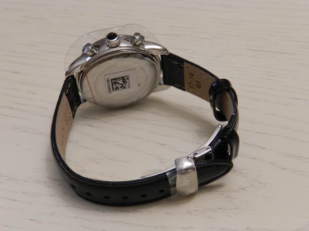 Модель имеет устойчивое к царапинам сапфировое стекло, ремешок из натуральной кожи черного цвета, белый циферблат.