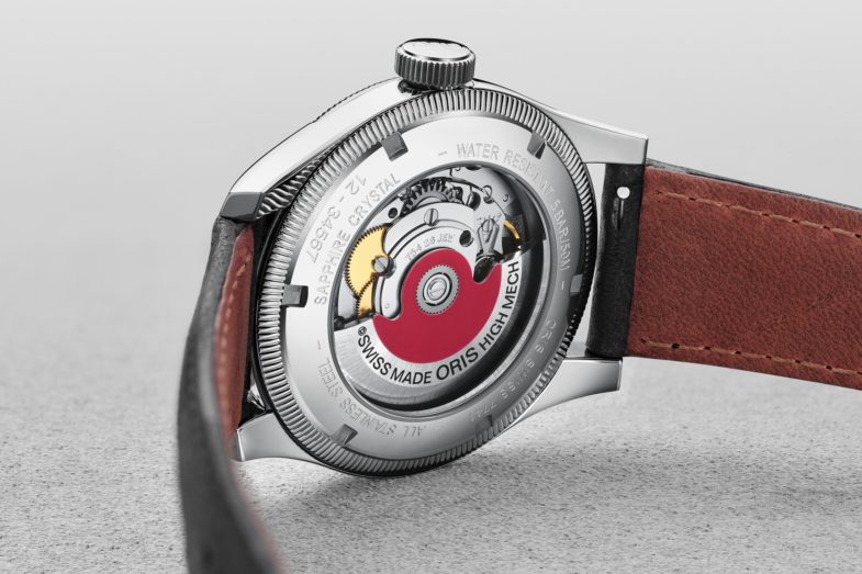 Задняя крышка несет на себе гравировку со старым логотипом бренда. Внутри часов установлен механизм Oris Cal. 733, основанный на Sellita SW 200-1.