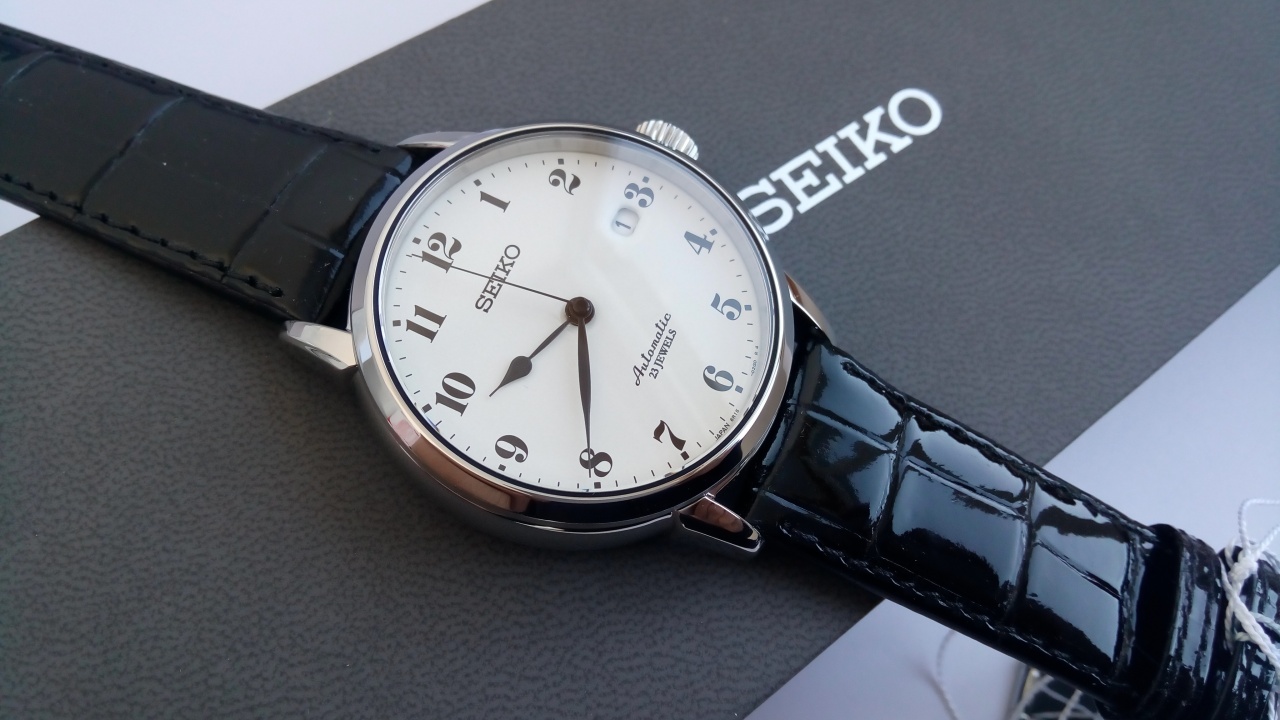 Модель 2015 года из коллекции SEIKO PRESAGE, выпущенная для внутреннего рынка Японии (JDM). Классический дизайн с циферблатом, вручную покрытым эмалью и нанесенными арабскими цифрами.