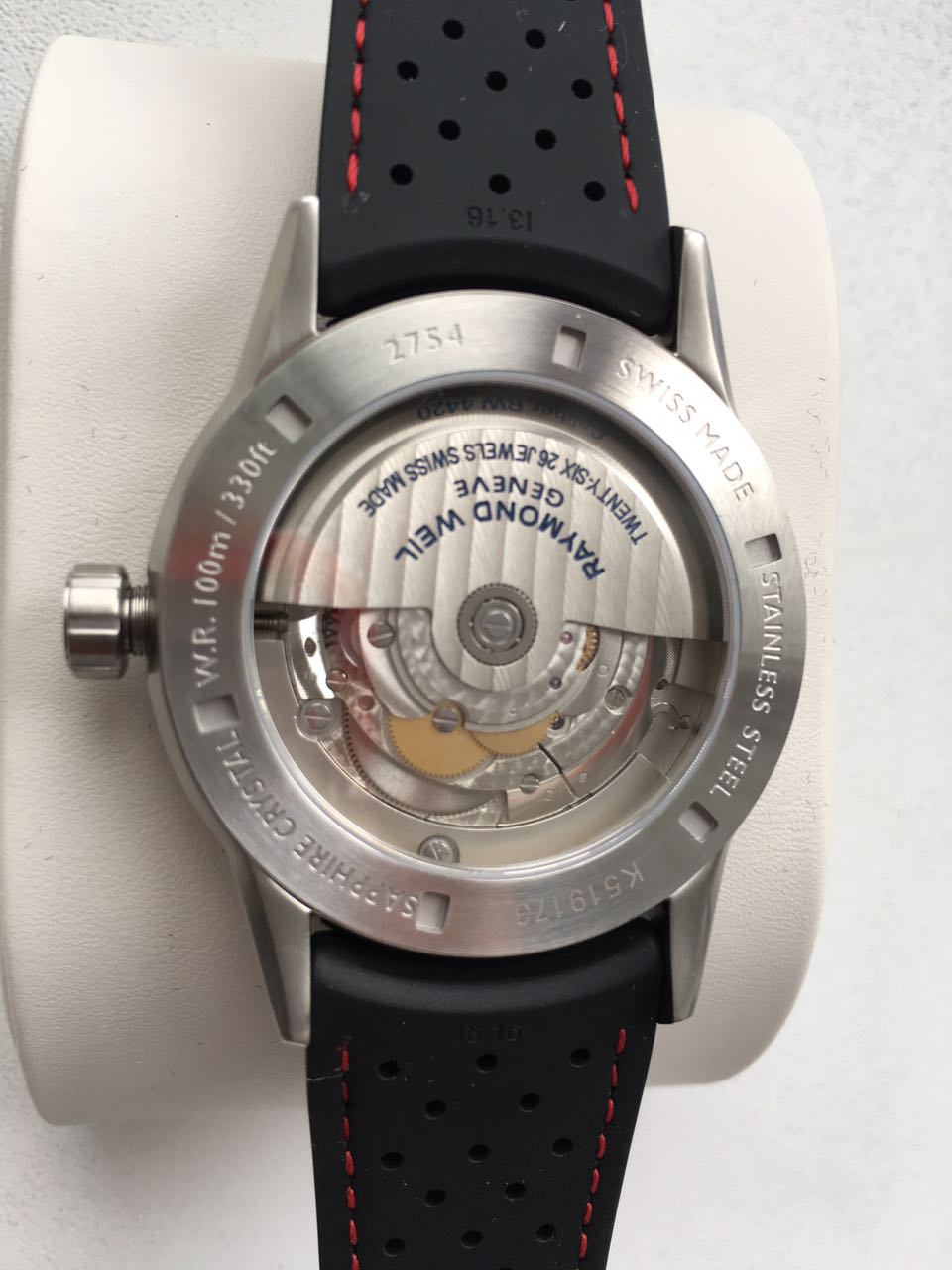 Стальной корпус на ремешке из натурального каучука с красной прострочкой и раскладывающейся застежкой, сапфировое стекло с двух сторон.