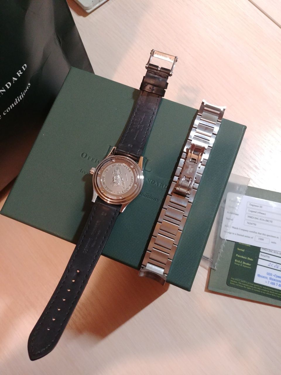 Продам отличные часы полученные по предзаказу в этом году в июне. Механизм BALL RR 1101, на основе ETA 2892. Антимагнитная защита до 80 000 а/м. Размер корпуса 40 мм. Тритиевая подсветка желтого цвета. Ход отличный, около +2 сек в сутки, при активной носке. Родной браслет изрядно поцарапан, на самом деле он просто полированный и царапается от взгляда (ничего страшнее офисного поюза часам не доставалось). В комплекте отдам отличный оригинальный резиновый ремешок с оригинальной стальной баклей. Ремешок сделан под крокодила, с обратной стороны так и не отличишь от кожи. Ремешок носился буквально один день. На корпусе часов только микроцарапки, которые возможно разглядеть только с лупой.