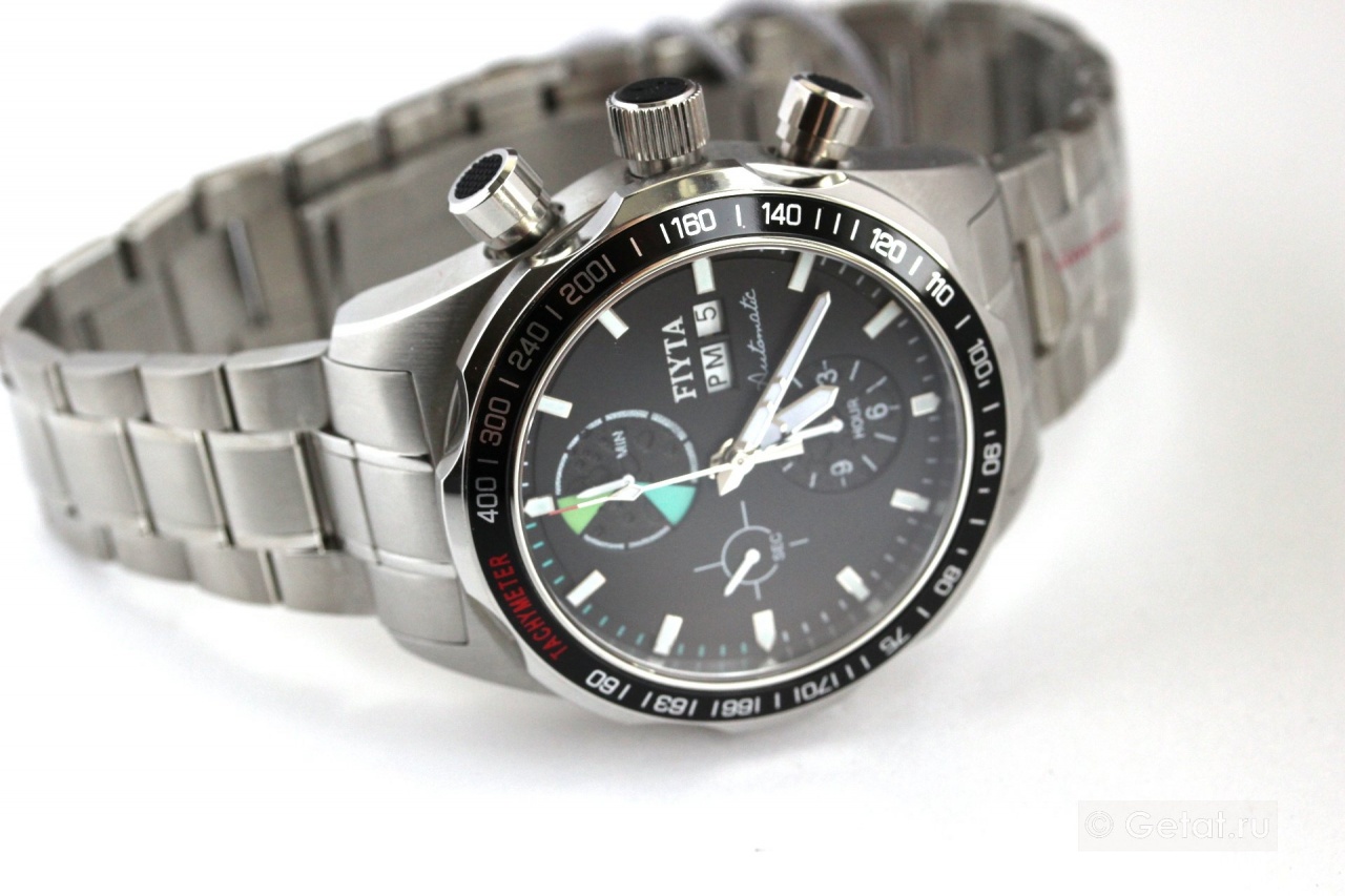 Механизм — FIYTA automatic, 30 камней, 28800 пк/час (он же калибр от фабрики Shanghai, который был специально разработан для Fiyta и соответствует требованиям космической программы). Счетчик хронографа на 45 минут, вместо дня недели — показатель день/вечер (AM/PM). Антимагнитная защита и антишоковая защита.