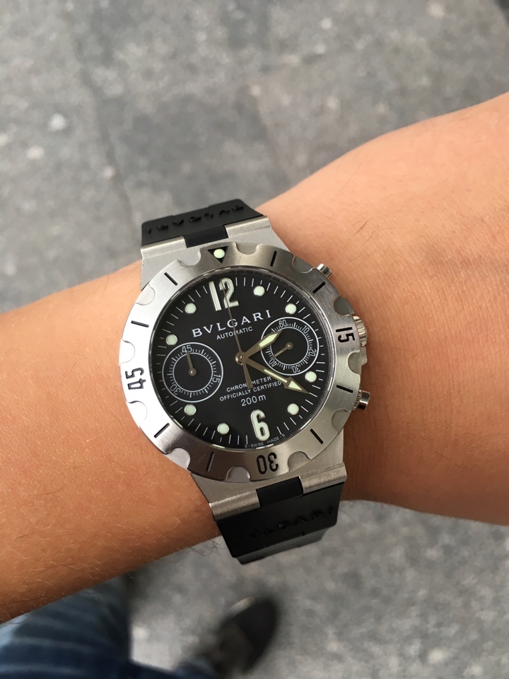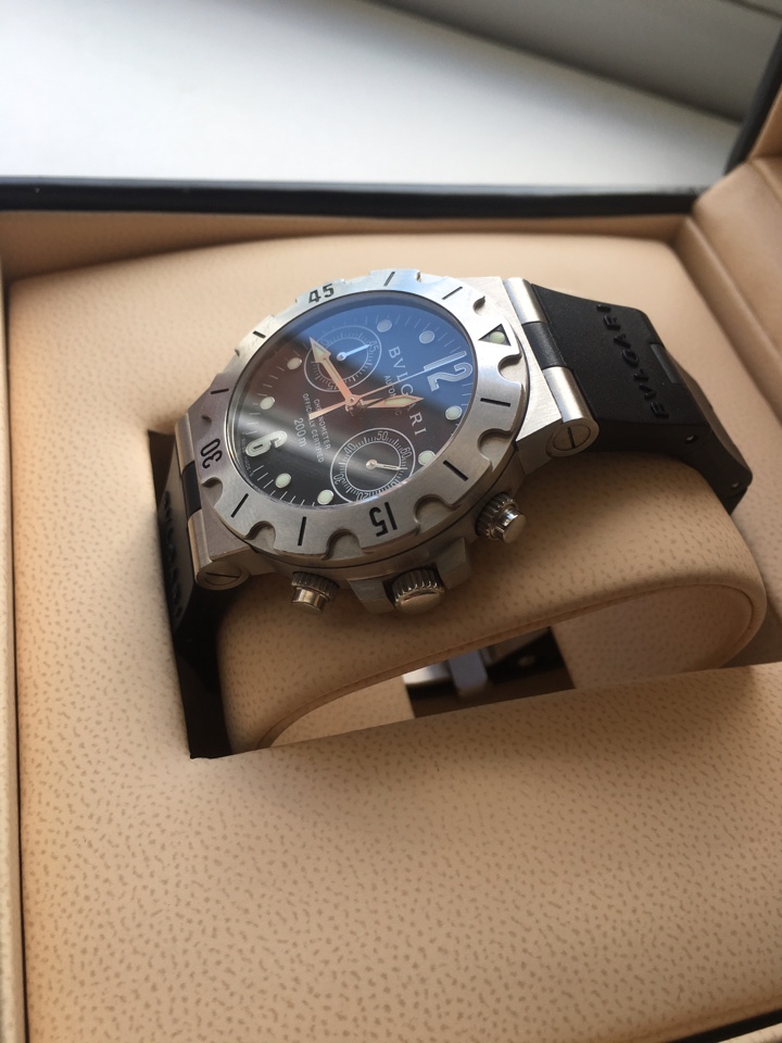В продаже великолепный дайвер от люкс бренда Bulgari. Узнаваемый дизайн, удобный размер, общее качество изготовления и все плюшки делают эти часы одними из лучших предложений в этой категории. В свое время ритейл часов был около 6000 долларов.