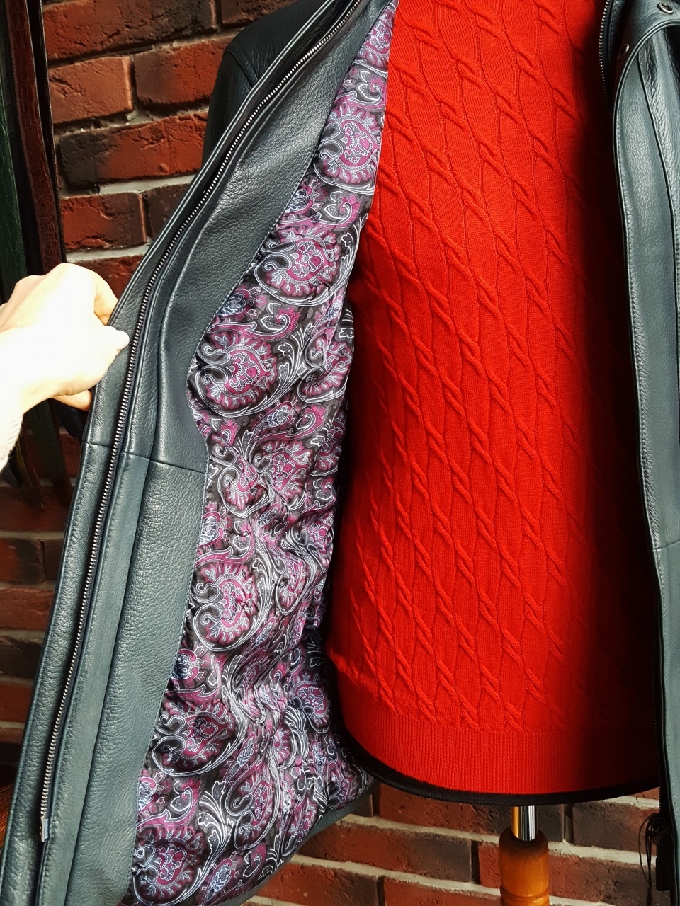Куртка застегивается на молнию с двумя бегунками из кожи оленя (позволяют расстёгивать молнию в двух направлениях) и потайные металлические кнопки, и имеет два прорезных нагрудных кармана, два накладных боковых кармана с клапанами, застегивающимися на потайные металлические кнопки, и два прорезных боковых кармана по бокам накладных.