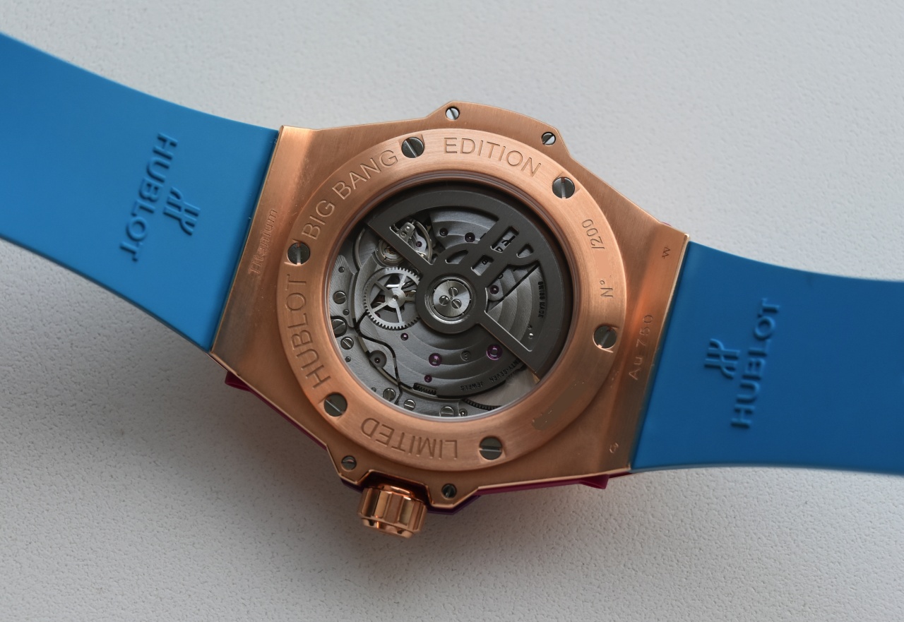 Ремешок: синий фактурный каучук, дополнительный ремешок из фиолетового каучука и розовой кожи, ремешок из розового каучука и розовой и фиолетовой кожи аллигатора, браслетная застежка из золота King 18K и титана с покрытием из золота.