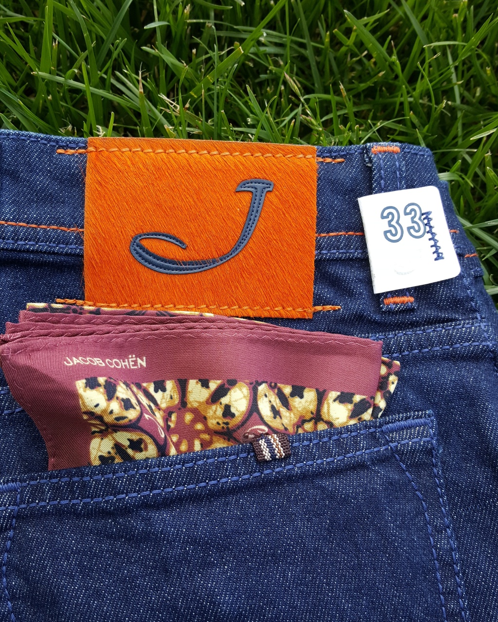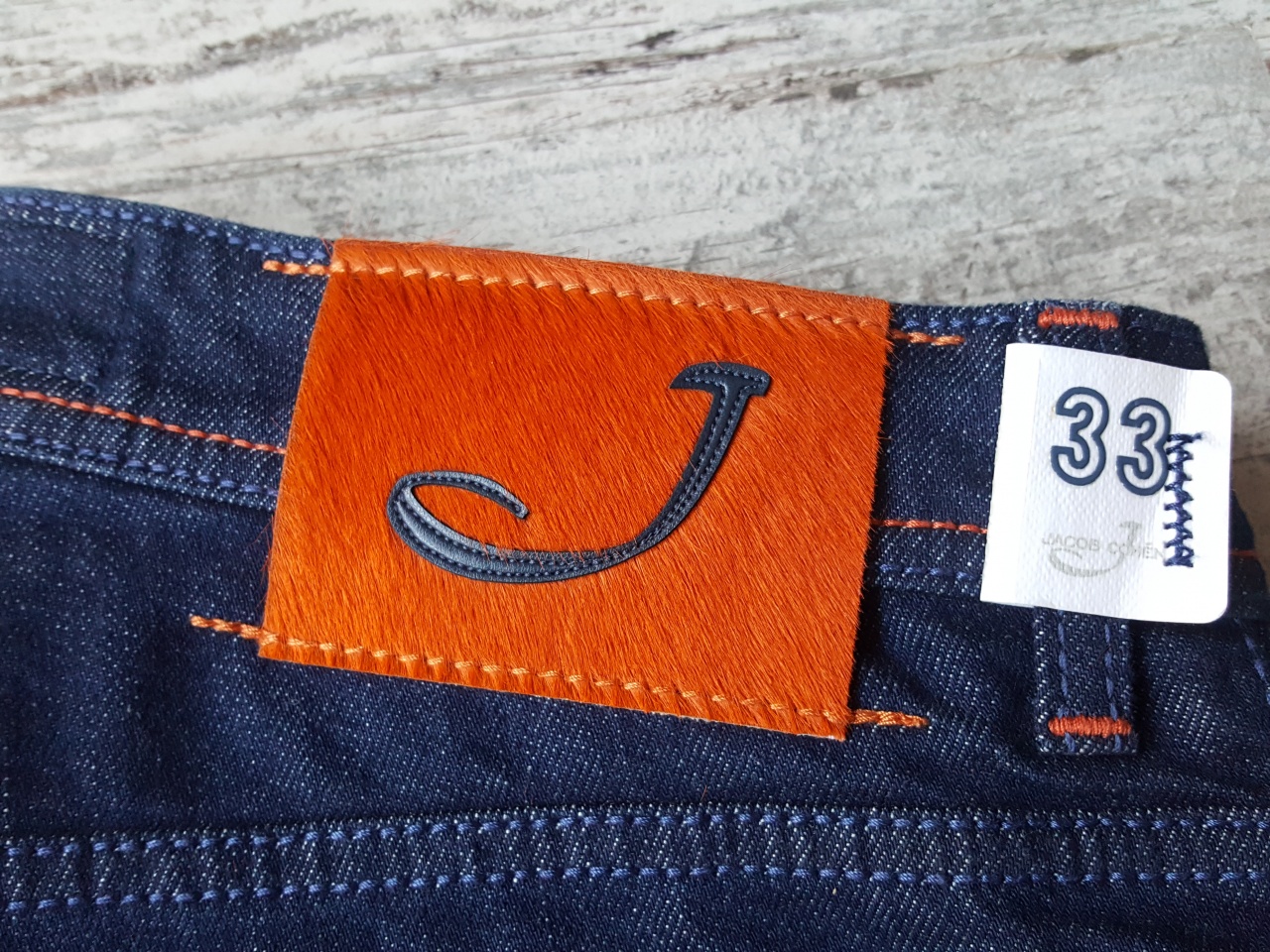 Сзади на правом бедре джинсы имеют фирменный ярлык из кожи пони оранжевого цвета с вышитым логотипом марки Jасоb Соhёn - буквы «J».