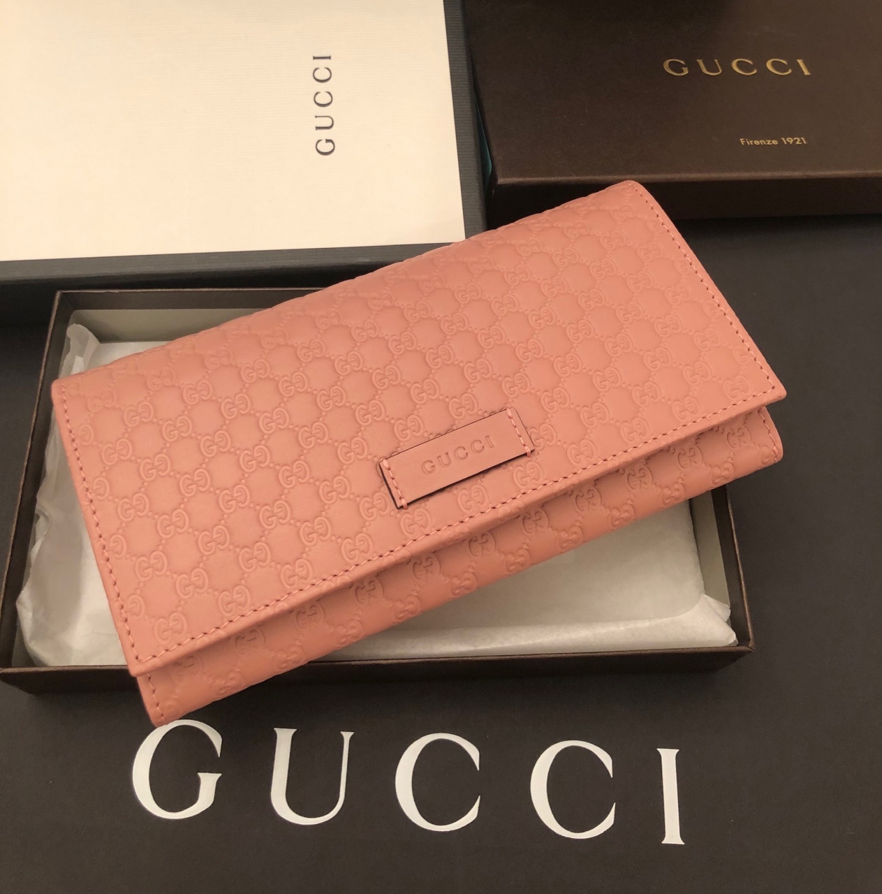 Портмоне из матовой кожи нежного пудрового оттенка с тиснением Signature. Очень вместительное! Внутри множество различных отделений, часть на самом клапане, благодаря которым удобно пользоваться картами, не раскрывая все портмоне. Стойкая к царапинам кожа, красивый цвет, портмоне смотрится очень дорого и отлично носится. Актуальная коллекция и must have от Gucci последние несколько лет!