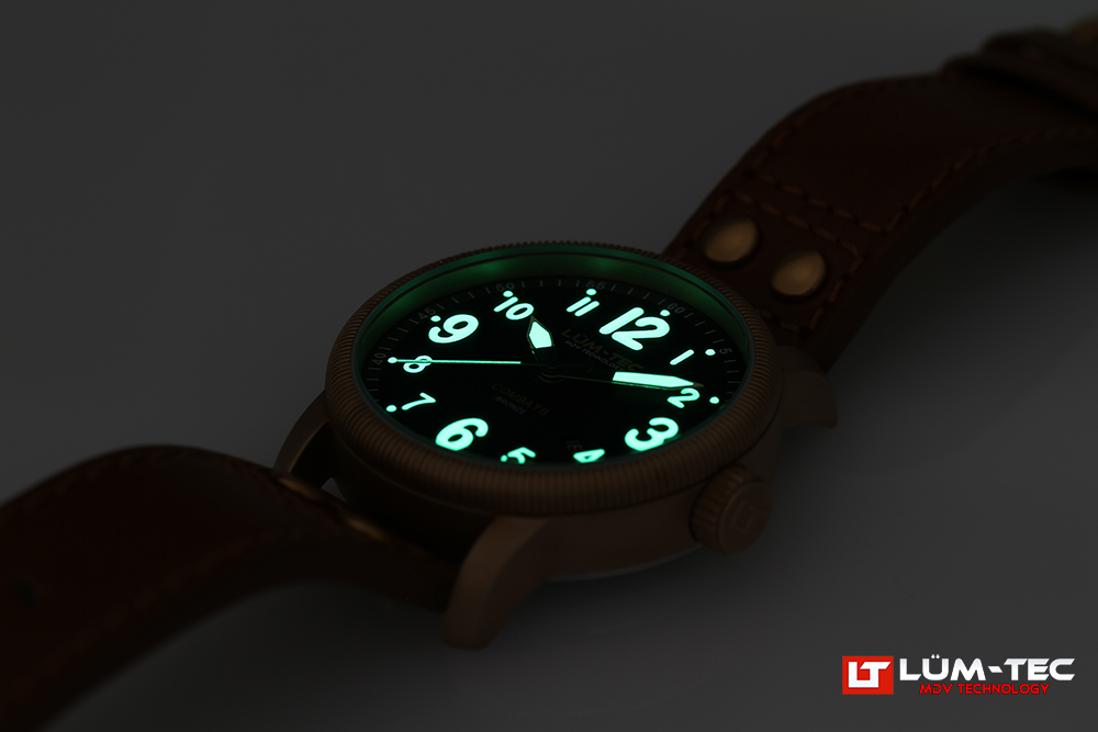 Часы LUM-TEC произведены с использованием эксклюзивной технологии LUM-TEC MDV Technology® - метод восьмислойного наложения ультра-яркого фото-люминесцентного материала Super-Luminova, обеспечивающее уникальную видимость часовых меток при любом освещении.