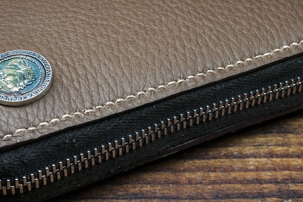 На кошелька шильда из серебра, в которую вмонтирована бронзовая монета, имитирующая древнеримскую, с изображением Цезаря. Гарантирует подлинность ручной работы.