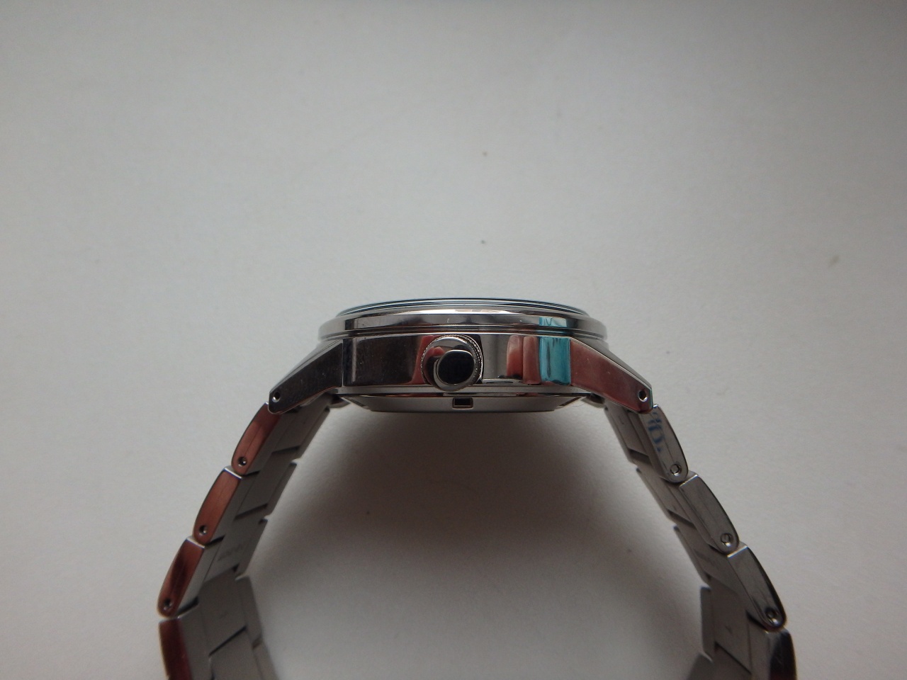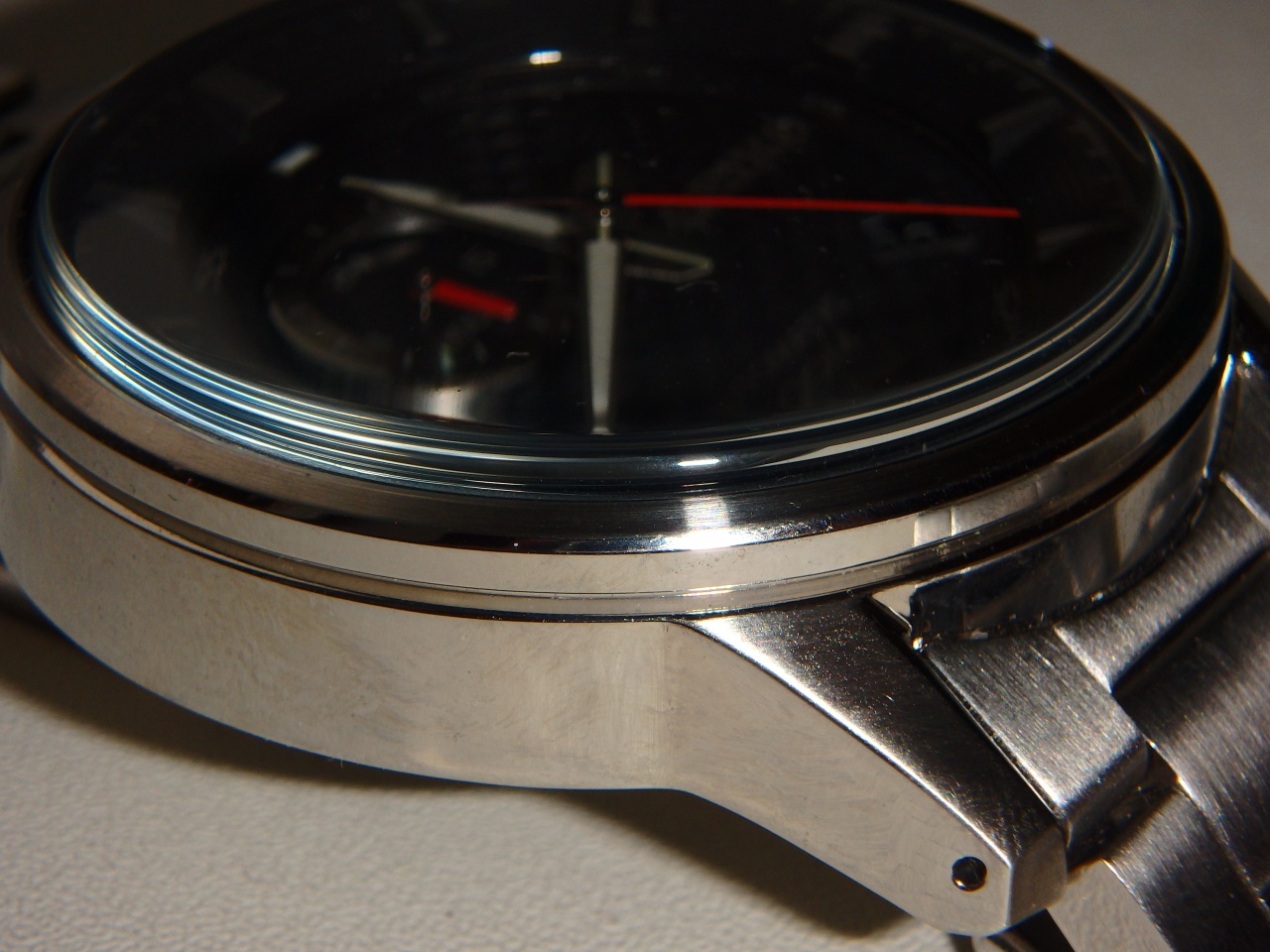 Часы на стальном браслете и с ним все не однозначно. С одной стороны литые звенья, но за исключением крайних и штампованной застежки. Центральный сегмент каждого звена имеет полированную вставку, за счет чего браслет смотрится более нарядным, особенно в сочетании с полированными боковинами звеньев. Но те стороны, которыми звенья расположены друг к другу, обработаны гораздо хуже и ощутимо шероховатые при касании.