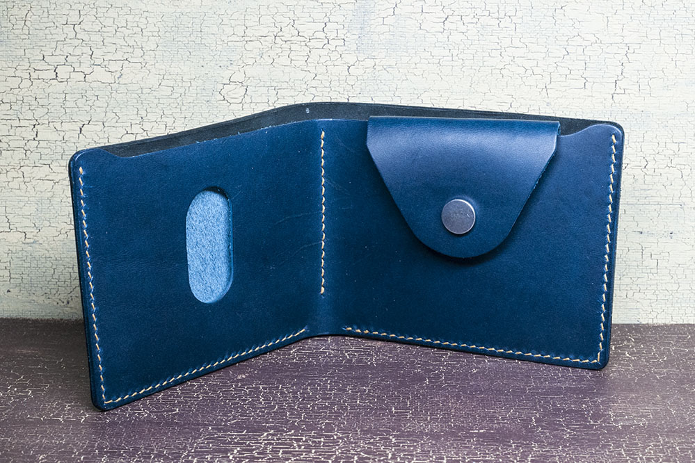 Кошелек прошит полностью вручную с использованием шила для создания особого шва.