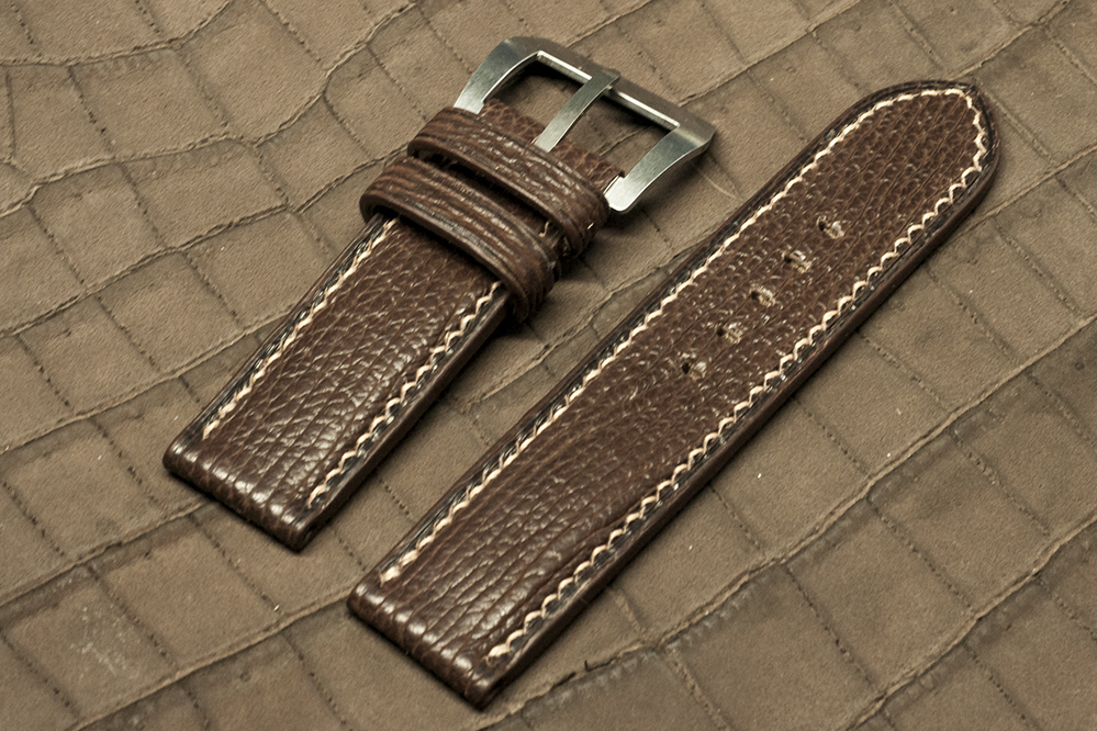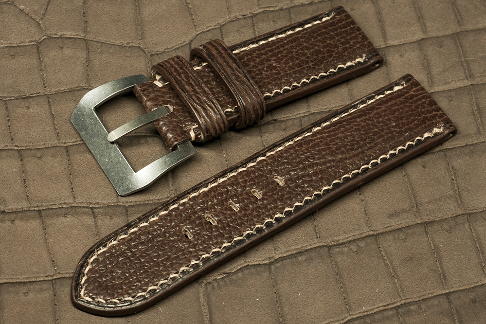 2) Ремешок сшит из кожи акулы цвета горького шоколада производства США.