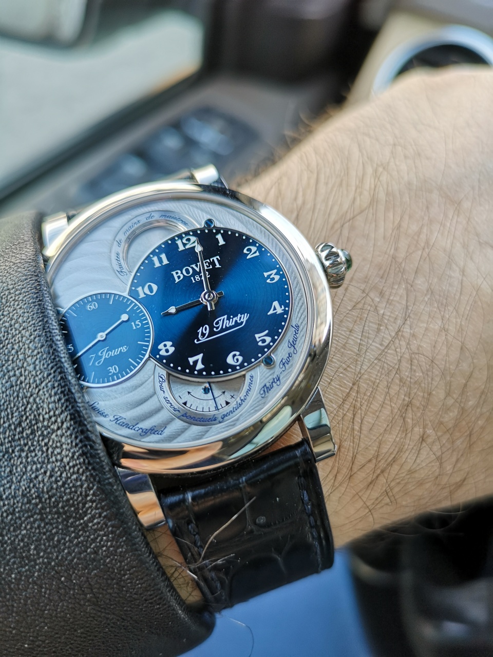 Продаю красивейшие bovet 19thirty c синим лицом на полном комплекте. Размер часов 42х9.8, очень удобные и невесомые на руке. Мануфактурный красиво декорированный механизм с запасом хода 7 дней. Индикация часов, минут, секунд и запаса хода. Все что нужно для счастья)).. Покупал новыми в пленках в 2016 году, носил редко, состояние НОВЫХ часов (не фигура речи, можно убедится лично). Цена, при этом, в 2 раза ниже рекомендованного ритейла.