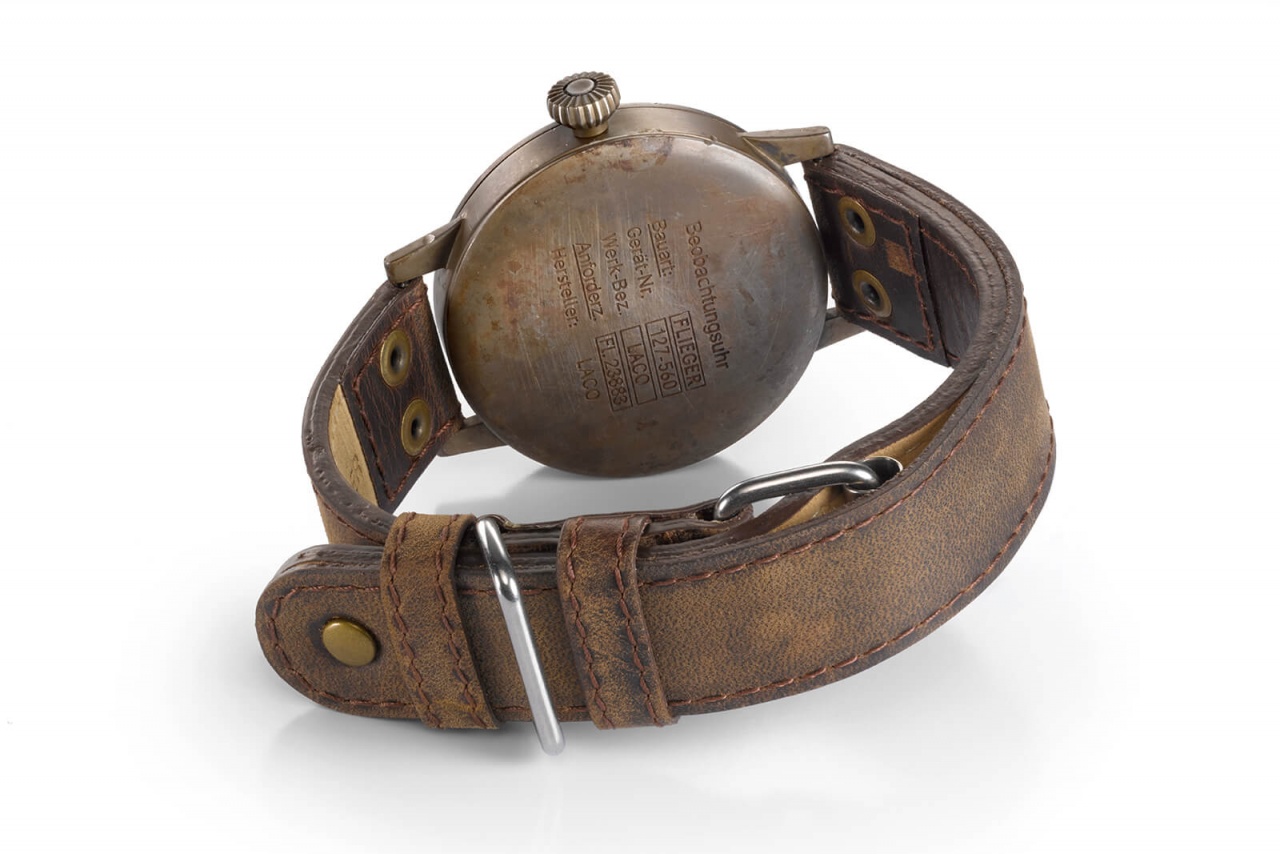 И стоит добавить, что оригинал имел циферблат черного цвета с метками и стрелками, покрытыми радием (226Ra). Новинка от Laco представляет собой полную противоположность, как будто негатив: черные метки на светлом, нарочито состаренном циферблате, полностью покрытом люминесцирующим составом Superluminova C3. Стрелки термически синенные.