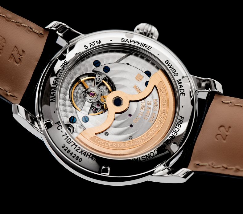 Модель оснащена новым мануфактурным швейцарским автоматическим механизмом Frederique Constant FC-712, на 28 камнях, с балансовой частотой 28800 полуколебаний в час (4 гц), запасом хода 38 часа, функциями индикации часов, минут, секунд (посредством соответствующих центральных стрелок), даты (посредством круглого аналогового указателя с цифровой разметкой, расположенного на 9 часах) и фаз Луны (посредством соответствующего указателя, расположенного на 3 часах). Основанный на серии FC-700, новый калибр был переработан для разделения указателей лунной фазы и даты на два раздельных указателя. Оба последние регулируются с помощью заводной головки. Отделу исследований и разработок Frederique Constant и часовым мастерам потребовалось два года, чтобы усовершенствовать этот часовой механизм и представить его на рынок. Калибр отлично отделан и декорирован.