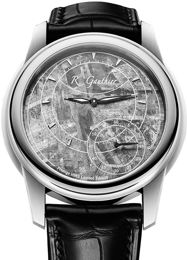 Швейцарская независимая часовая компания Romain Gauthier запускает первые серийные часы, изготовленные из нержавеющей стали. Новые Prestige HMS Stainless Steel - это также первые часы Romain Gauthier с циферблатом, полностью выполненным из метеорита. Для этой модели был использован метеорит Henbury, который встречается гораздо реже, чем обычный метеорит Gibeon, применяемый большинством марок для своих циферблатов. Помимо метеорита на циферблате этой модели, единственный другой известный образец Henbury находится в Южно-Австралийском музее минералов, метеоритов и камней в Аделаиде.