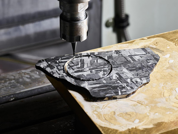 Метеорит, использованный для изготовления часового циферблата, был обнаружен в 1931 году на кратерном поле Хенбери в северной части Австралии. Технически говоря, это октаэдрит, состоящий в основном из никелево-железных минералов, таенита и камасита, и получил свое название от восьмигранной формы кристаллов камасита.