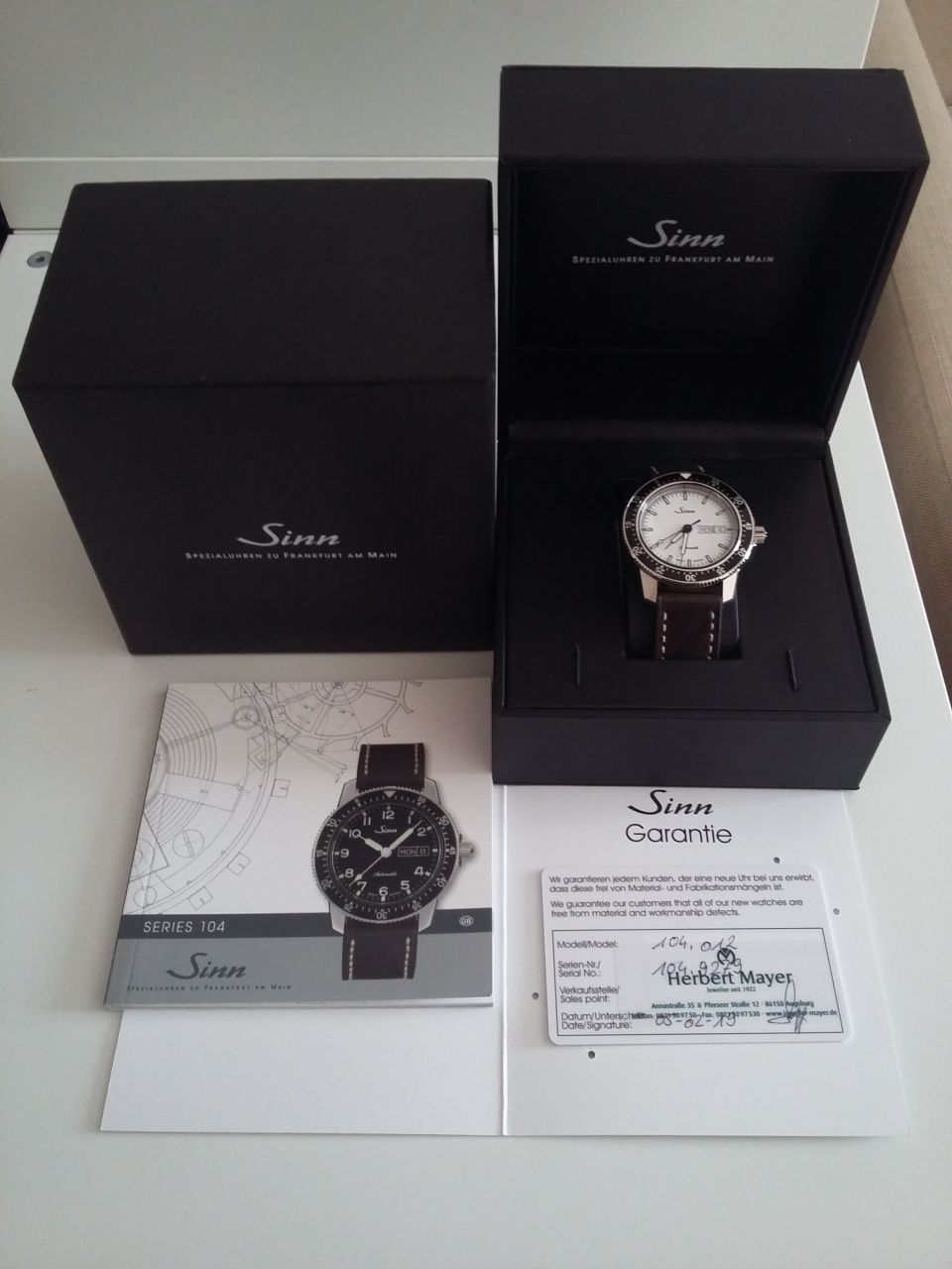 Sinn 104. Белый циферблат. Без цифр. Коричневый ремень.
