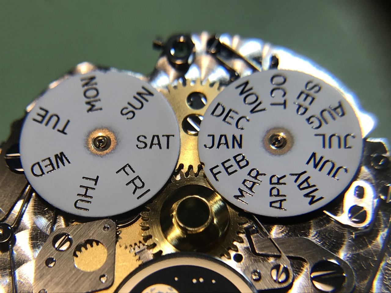 2. при разъединении механизма от модуля колесо даты А выходит из зацепления с часовым колесом и свободно удерживается только за счет дисков календарей.
