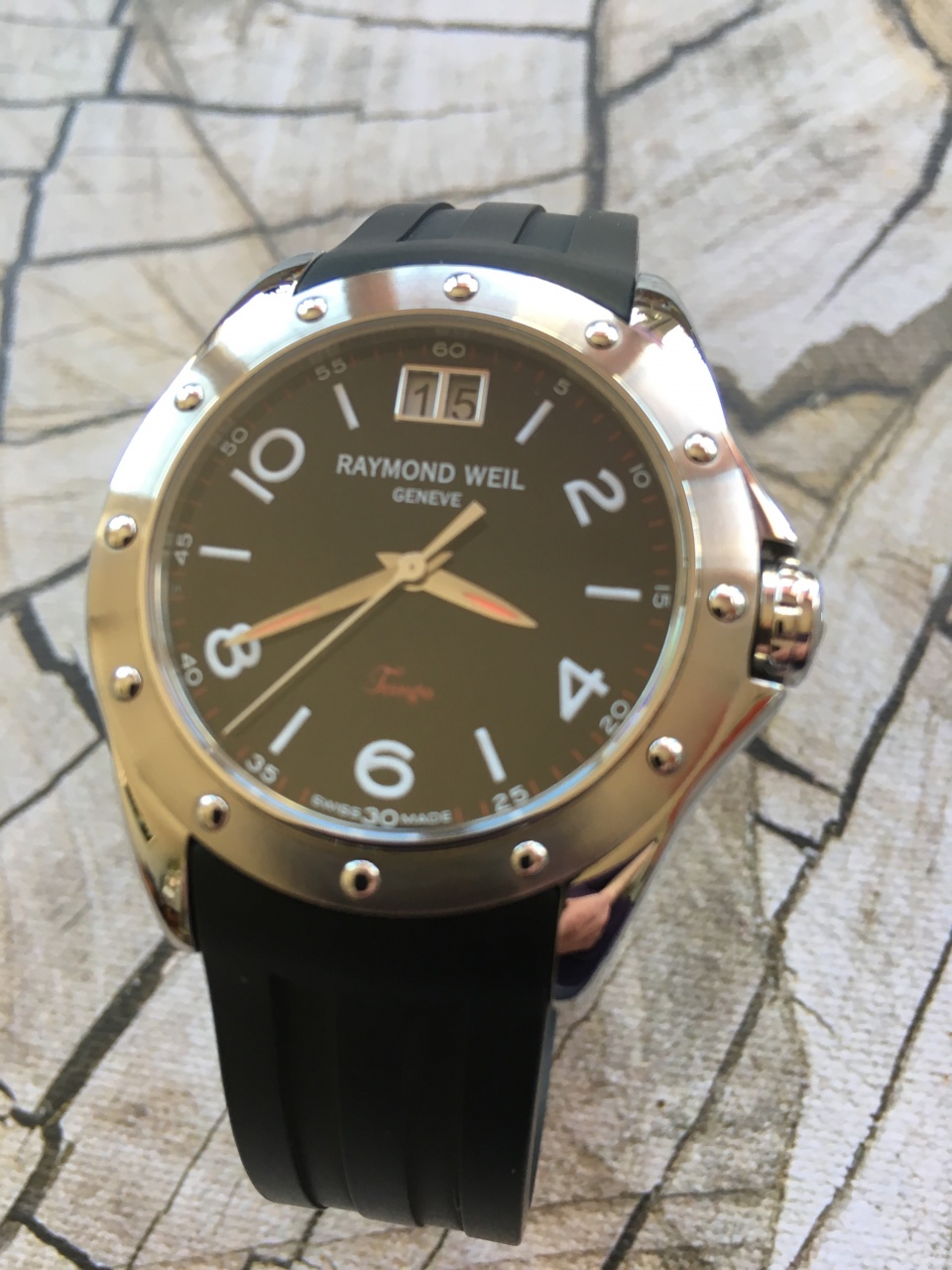 В наличии интересные и редкие часы Raymond Weil Tango 5595/1-SR-05207 в прекрасном состоянии! Одевали несколько раз. Коробка и документы не сохранились. Установлен новый элемент питания (15.04.19г.) Как говориться одел и пошел, никаких вложений не требуется!
