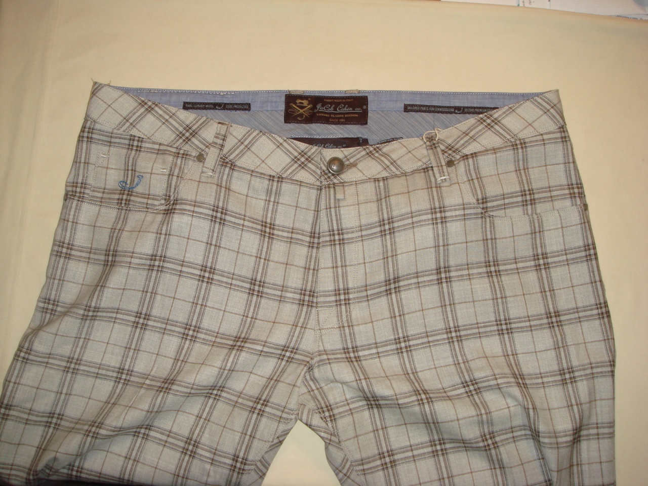 Продаются новые мужские летние шерстяные брюки джинсового кроя ручной работы итальянского бренда JACOB COHEN, превосходного исполнения, цвет светло-серый в коричневую клетку, логотип, TYPE 688 , клаcическая посадка на талии (regular fit), застёгивается на пуговицы из буйволиного рога и основную фирменную посеребренную пуговицу с логотипом бренда, фирменный ярлык из кожи пони бежевого цвета с вышитым логотипом марки Jасоb Соhёn, к брюкам прилагается платок, состав: 70% высококачественная шерсть( фабрика Loro Piana) , 15% шелк, 15 % лен, все бирки прилагаются , гарантированный 100% оригинал, размер 42 , производство Италия
