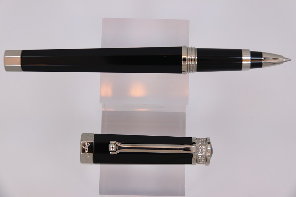 Ручка-роллер Монтеграппа выполненна в неповторимом восьмигранном дизайне серии Nero Uno. Корпус пишущего инструмента сделан в строгом черном цвете из драгоценной смолы. Металлические делали покрыты палладием. Верхняя часть инструмента так же украшена ювелирными кристаллами Сваровски, выложенными по всей окружности колпачка. На ободе в нижней части колпачка выгравирован логотип компании Монтеграппа.