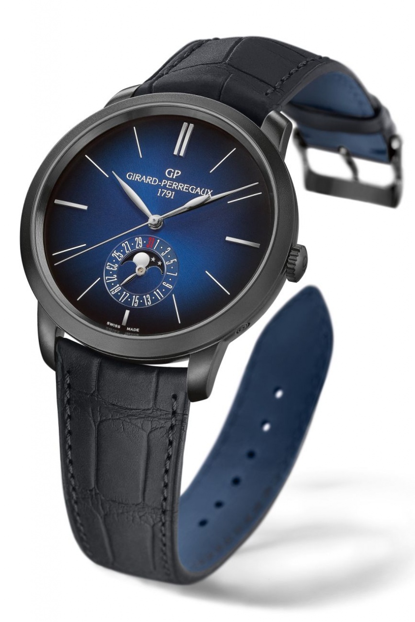 Круглый корпус новинки, изготовленный из нержавеющей стали с черным DLC-покрытием, диаметром 40,0 мм, водонепроницаемый до 30 метров. На торце рифленой заводной головки, расположенной на 3 часах, выгравирован логотип бренда Girard-Perregaux. Сапфировое стекло установлено на передней стороне часового корпуса (с антибликовым покрытием) и на его задней крышке. Выпуклый синий циферблат с мелкозернистой отделкой, продолговатыми накладными часовыми индексами. Стрелки полированные, выполненные в листьевидной форме.