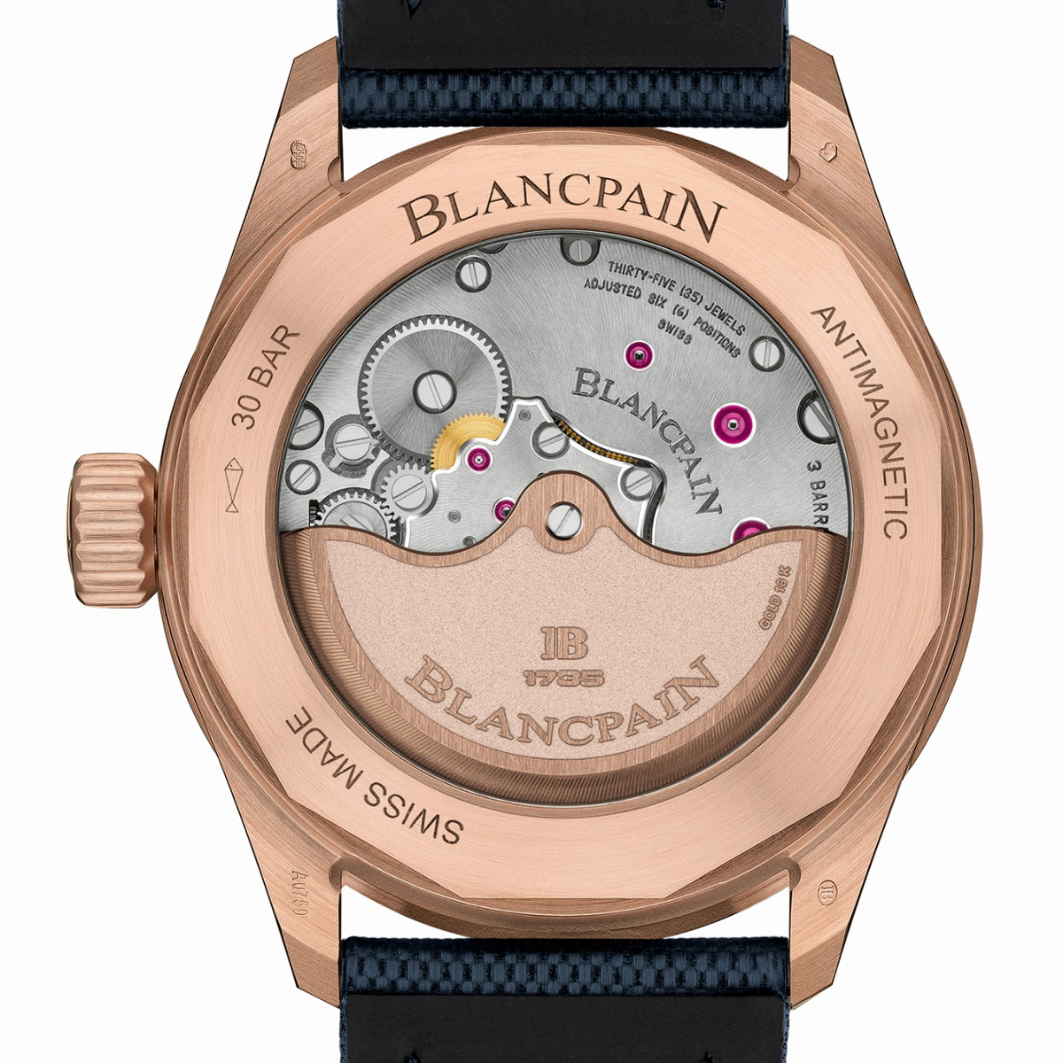 Сквозь прозрачную заднюю крышку часов можно рассмотреть мануфактурный калибр Blancpain 1315, автоматический механизм с 5-дневным запасом хода, обеспечивающимся тремя заводными барабанами. Калибр, состоящий из 227 элементов, включая 35 камней, работает на частоте 4 Гц и оснащен антимагнитной кремниевой пружиной баланса. Финишная отделка включает в себя декоративное сатинирование мостов, зеркальную полировку фасок и асфальтовую фактуру золотого ротора системы автоподзавода, на котором выгравирован логотип Blancpain. Модель представлена в двух вариациях - с ремнем из парусины с золотой застежкой (ref. 5000-36S40-O52A) или c текстильным ремнем NATO с золотой фурнитурой (ref. 5000-36S40-NAOA). Blancpain Fifty Fathoms Bathyscaphe Sedna Gold становятся частью регулярной линейки по цене 23 450 евро.