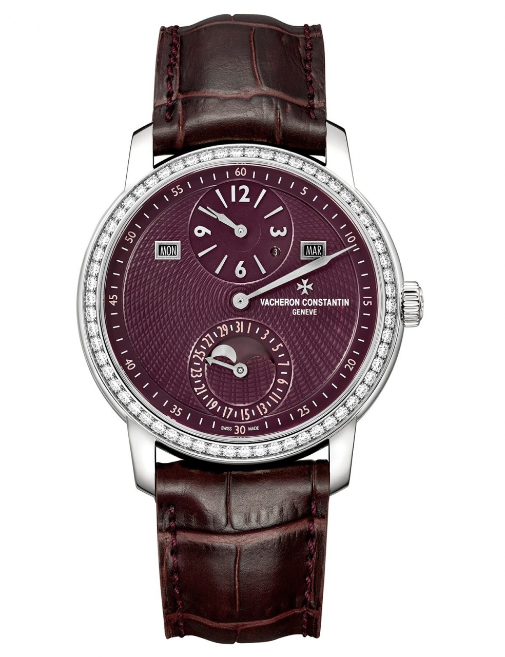 Эта модель – образец гармоничного дизайна и вместе с тем дань истории часового искусства. Точнее, тому ее периоду, когда часовые мастера в качестве источника эталонного времени использовали так называемые часы-регулятор. В таких часах минутная стрелка сохраняла свое центральное положение, а часовая была расположена отдельно, чтобы время на циферблате было видно из любой точки мастерской. В новинке Vacheron Constantin часы-регулятор усложнены вечным календарем. Изготовленный из белого золота корпус модели (42 х 11,80 мм) дополнен циферблатом оттенка «баклажан». Безель украшают 62 бриллианта. В цвет циферблата к часам подобран ремешок из кожи аллигатора. Работу модели обеспечивает автоматический калибр 2460 RQP, оснащенный 40-часовым запасом хода.
