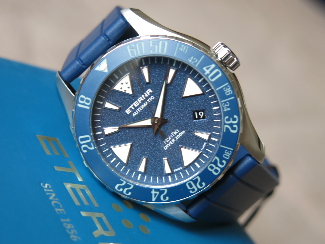 КЛАССНЫЙ СИНИЙ ДАЙВЕР ETERNA Kontiki - керамический безель / синий текстурированный цифер / синий каучук с клипсой с системой быстрого удлинения / 44мм / 200м