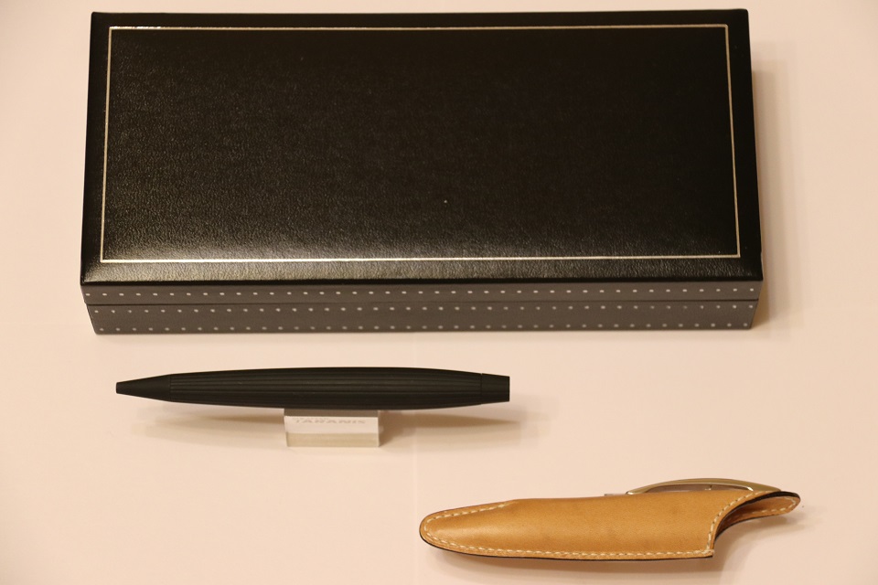 Комплект: ручка, кожаный чехол, шкатулка.