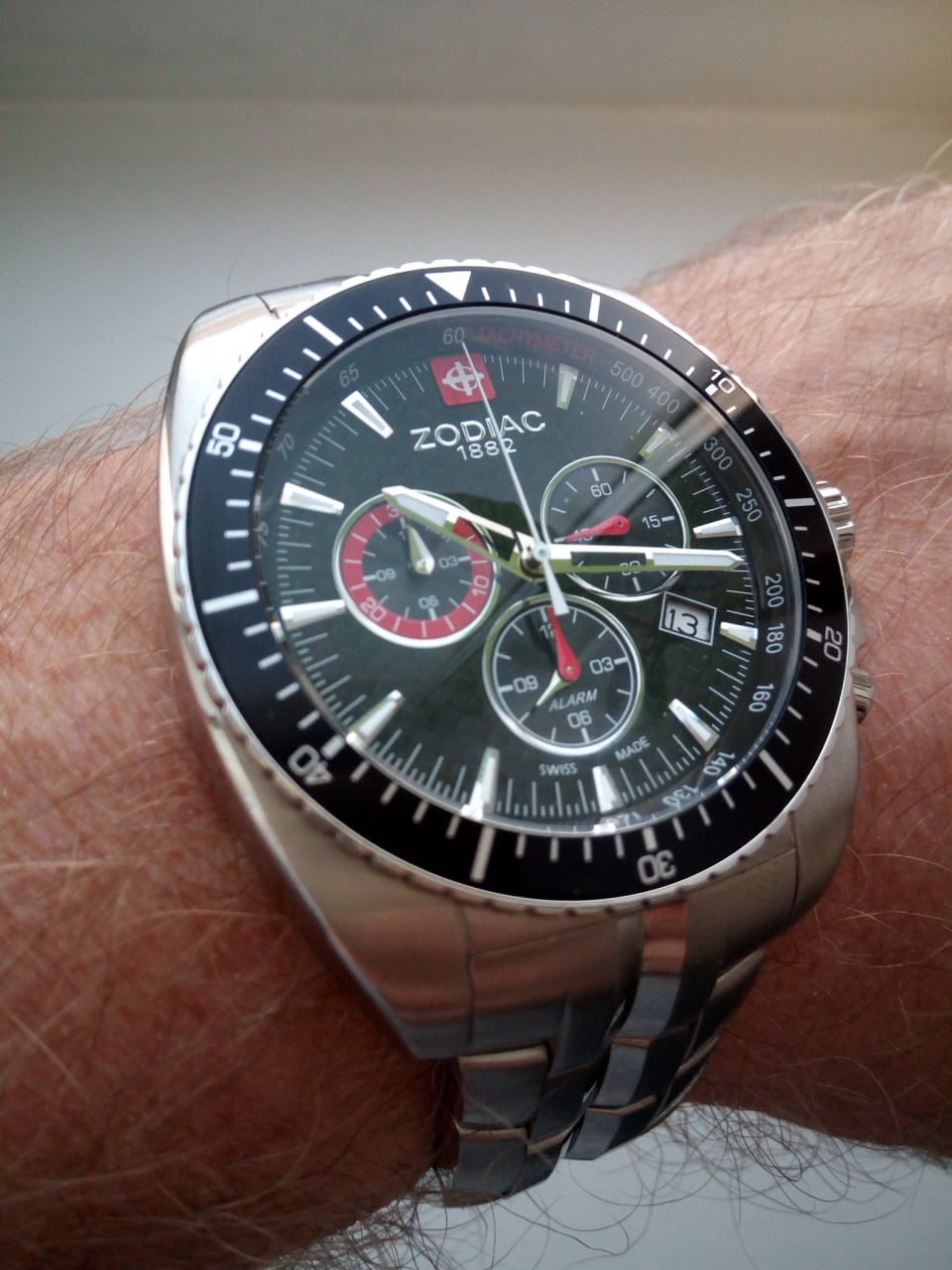 Дата на 4 часа, манеж секунды на 3 часа, манеж хронографа (минута/час) на 9 часов, манеж будильника (час/минута) на 6 часов