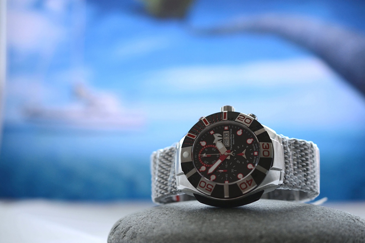 Кнопки хронографа крупные, завинчивающиеся. Функции хронографа - секунды, минуты и часы.