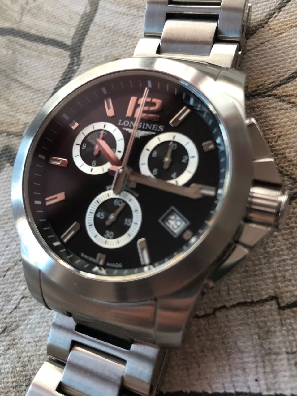 В наличии популярный хронограф от Longines Conquest L3.660.4.56.6 в отличном состоянии! Производилось сатинирование безеля и центральных звеньев браслета, как по мне удачное и практичное решение! В комплекте: часы, внешняя коробка, шкатулка, доп. звенья. Стоит свежий элемент питания.