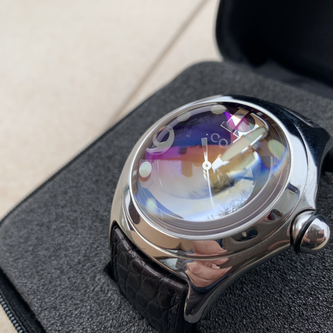 CORUM BUBBLE BOUTIQUE с темно-синим циферблатом на черном ремне.
