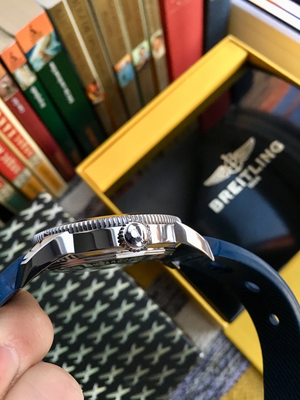 Эти часы для дайверов, сохраняющие водонепроницаемость на глубине до 200 м, напоминают о функциональном и элегантном дизайне легендарной модели 1950-х годов. Корпус - нержавеющая сталь 316L. Механизм - Breitling 17 - механический с модулем автоподзавода, 28800 полуколебаний/час, 25 камней, сертифицированный хронометр C.O.S.C., запас хода до 40 часов. Сапфировое стекло с двойным антибликовым покрытием. Водозащита - 200 м. Ремень - синий каучук на клипсе. Диаметр корпуса 46 мм.