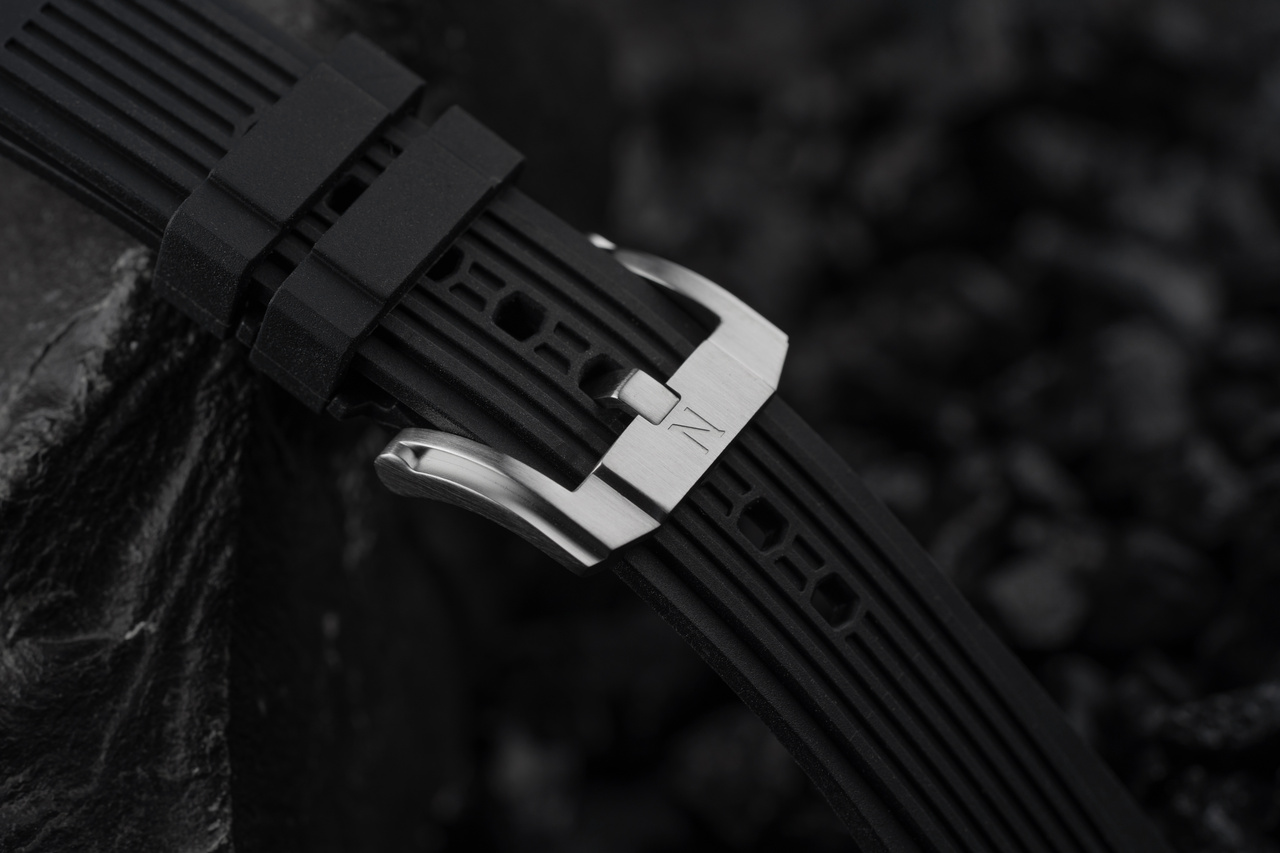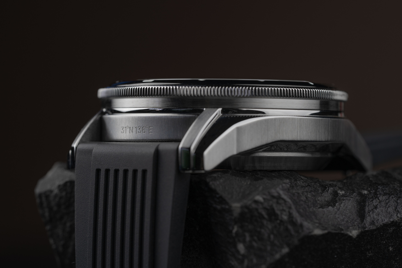 Концепция часов продумана до мелочей. Даже профиль бакли - чётко по размеру ремня. Ремень мне показался тонковатым. Пересадил на Ди-Модел Торнадо. Ширина между ушками - почти 23 мм. При желании можно втиснуть и "тяжёлую артиллерию" на 24 мм, но для моего запястья в 16 см это перебор. А вот гравировка порядкового номера и координат - очень мелкая. Полировка торцов строго противопоказана. Как бы патинирование эти надписи не съело